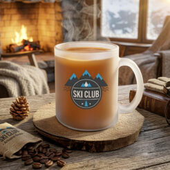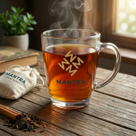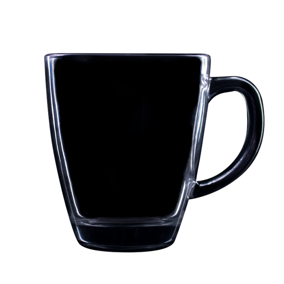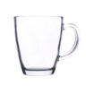 A glass mug with an oval shape and an ergonomic handle. Made of thick glass, it has a stable base.