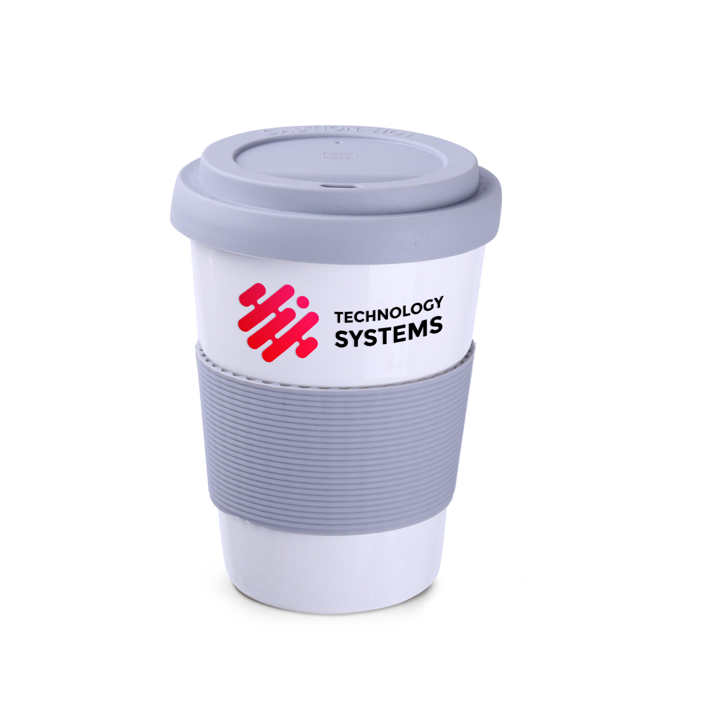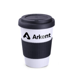 Mobile mug with great branding possibilities. Thanks to the double wall, it keeps the liquid inside warm for longer and protects your hands against burns. It has a silicone cover and a band, which are available in many color options.