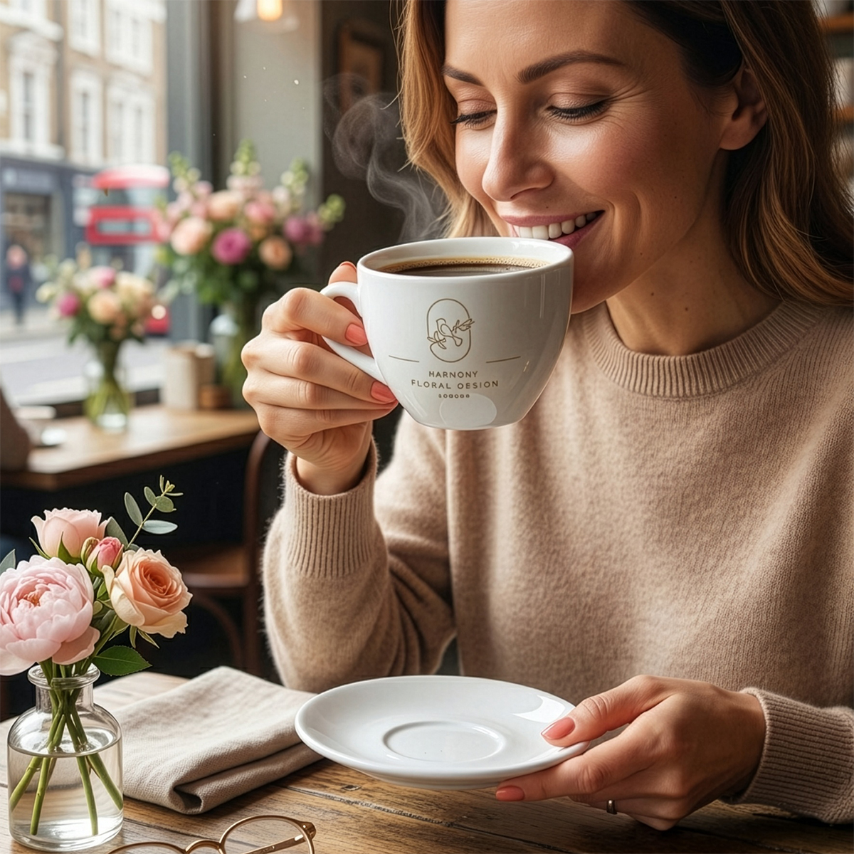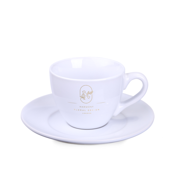 A classic cup with a universal capacity. It has an ergonomic handle and an interesting saucer.