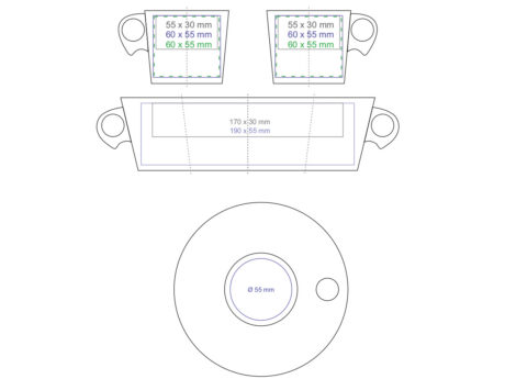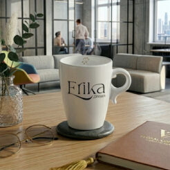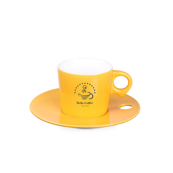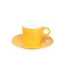 An eye-catching, colorful cup made of porcelain. It has an interesting shape and a designer handle corresponding to the saucer.