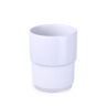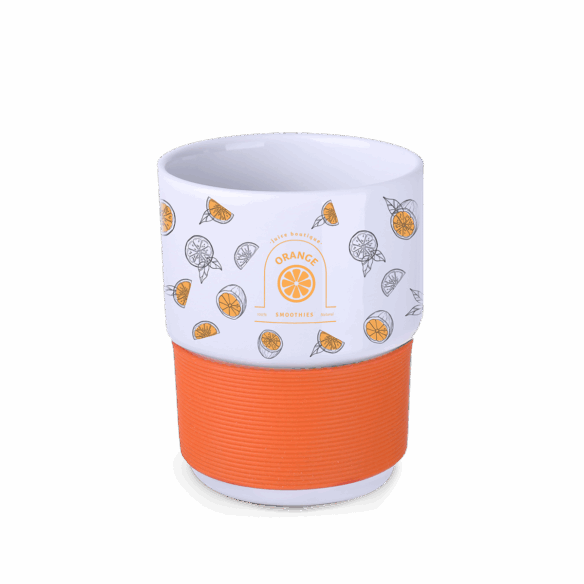 Medium-sized porcelain promotional mug without a handle. Design that allows stacking. Possibility to install additional, insulating bands (one band 40 mm wide or 2 bands 20 mm wide each). The bands are available in 7 colors: white, orange, red, green, navy blue, brown and black.