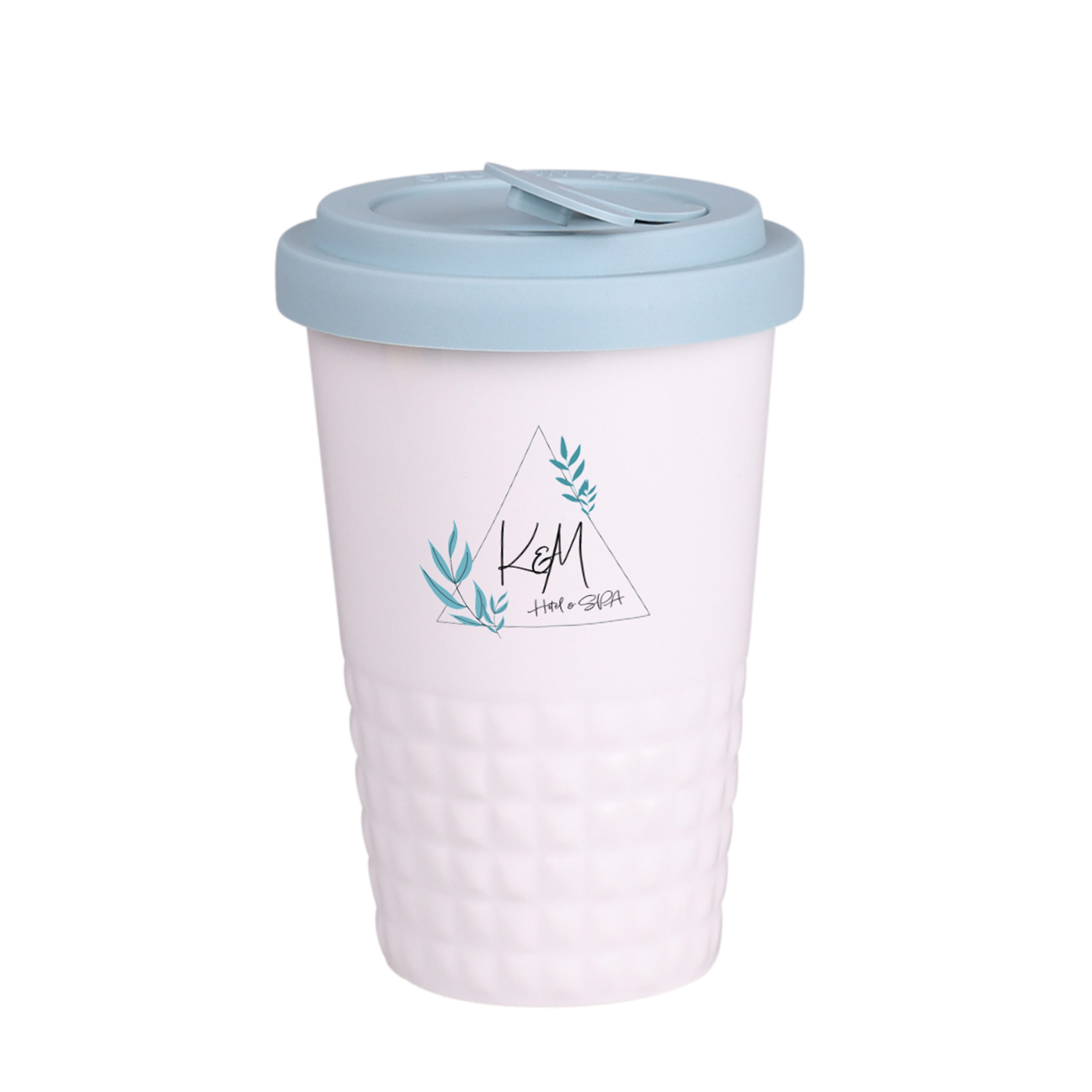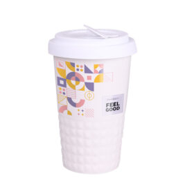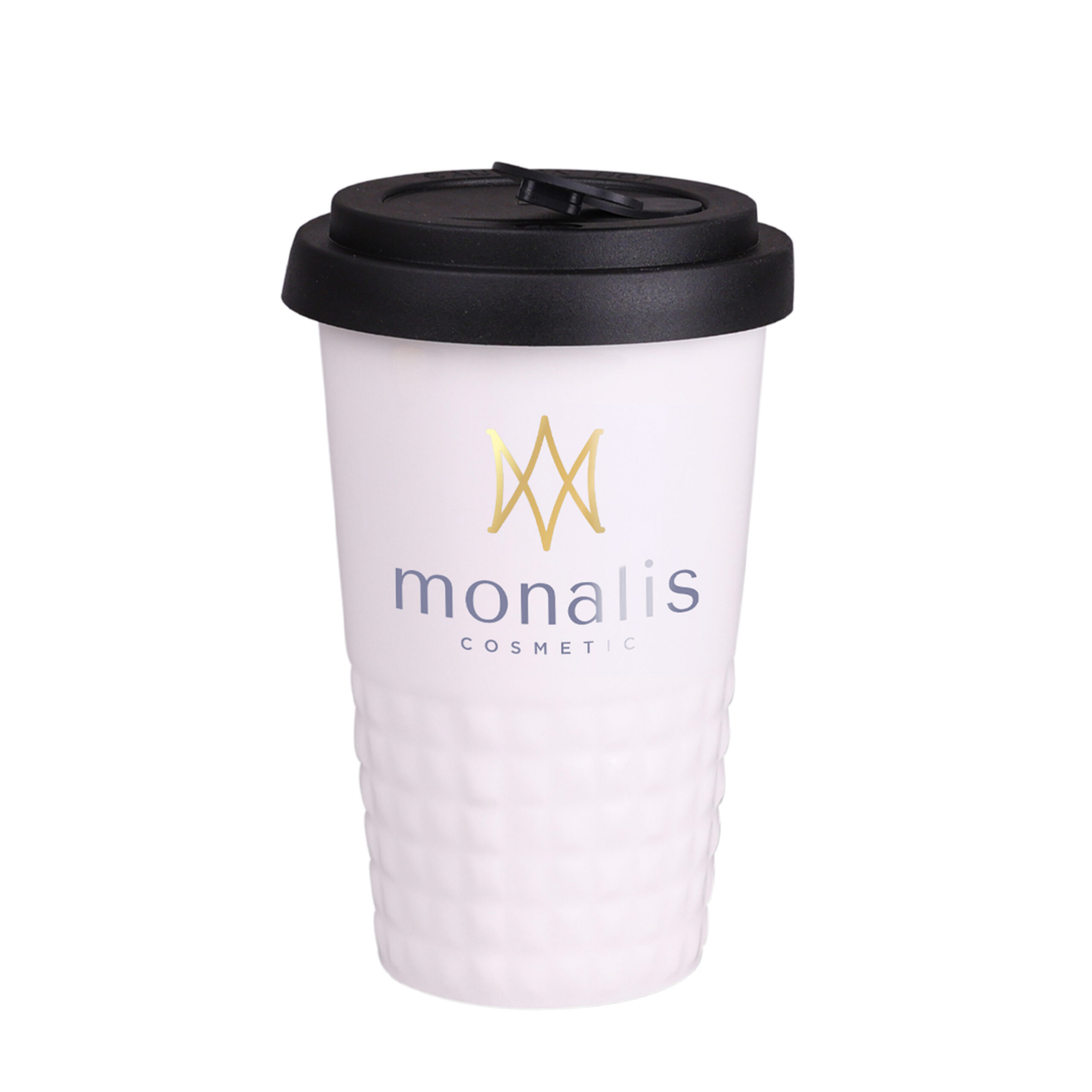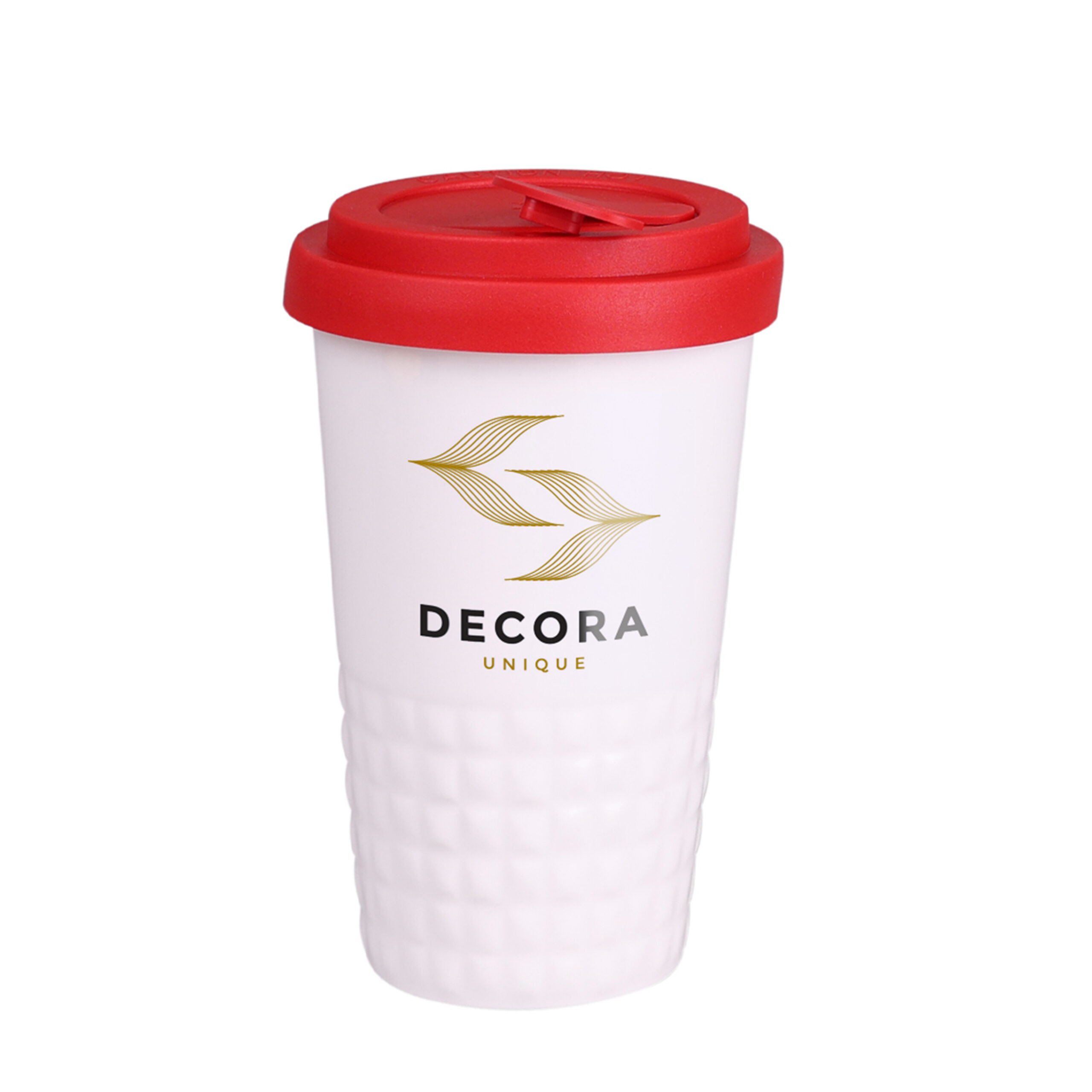 Designer mobile mug made of porcelain. It has a characteristic finish of the lower part in the form of protrusions. The model is intended for active people, lovers of trips and travel. Thanks to the rare internal structure of double porcelain walls, it is characterized by an increased level of thermal insulation. It has a cover with a tight cap, available in several colors.