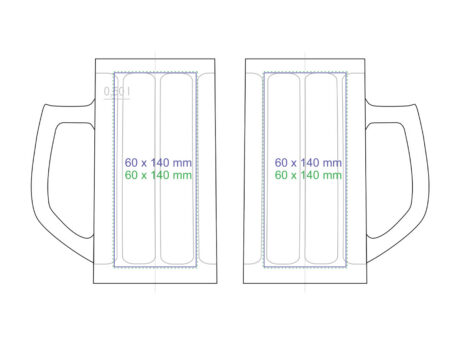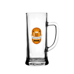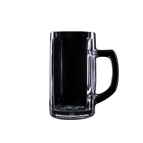 A roomy, simple beer mug produced in Europe. It has an ergonomic handle and decorative bends on the body.