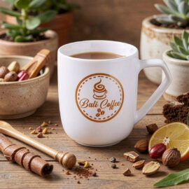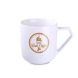 A barrel-shaped porcelain mug with an original handle. Combined with decoration, it will uniquely distinguish the brand from the competition.