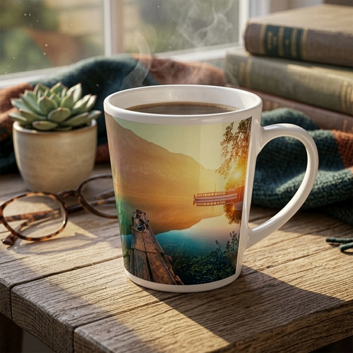 A sublimation mug with a classic trapezoidal shape. It can be printed in photographic quality. It has an ergonomic handle.
