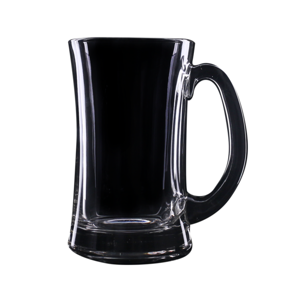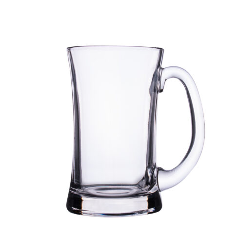 A massive classic beer mug with an interesting shape. It has an ergonomic handle and a thick and stabilizing bottom.