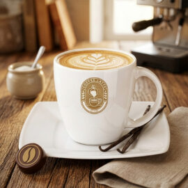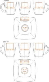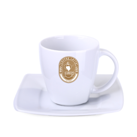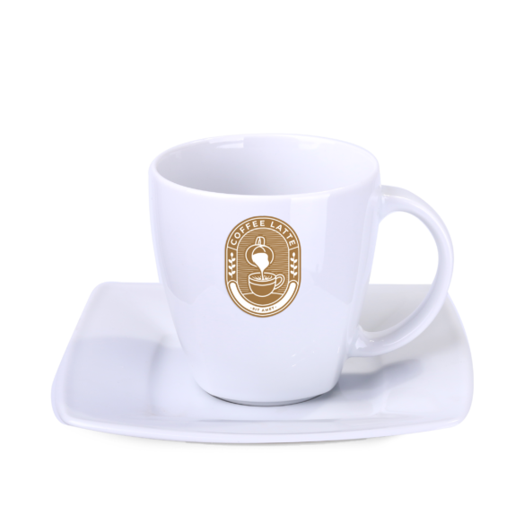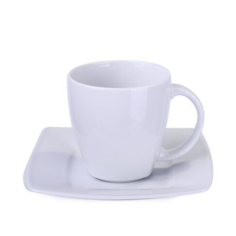 A porcelain set consisting of an elegant mug and a dedicated plate. A characteristic feature of this style are delicate square finishes visible in its lower part.