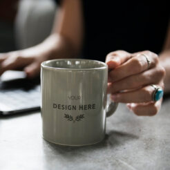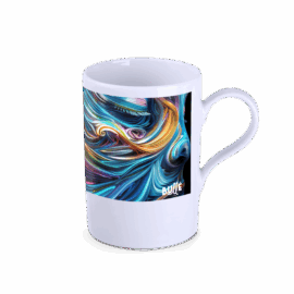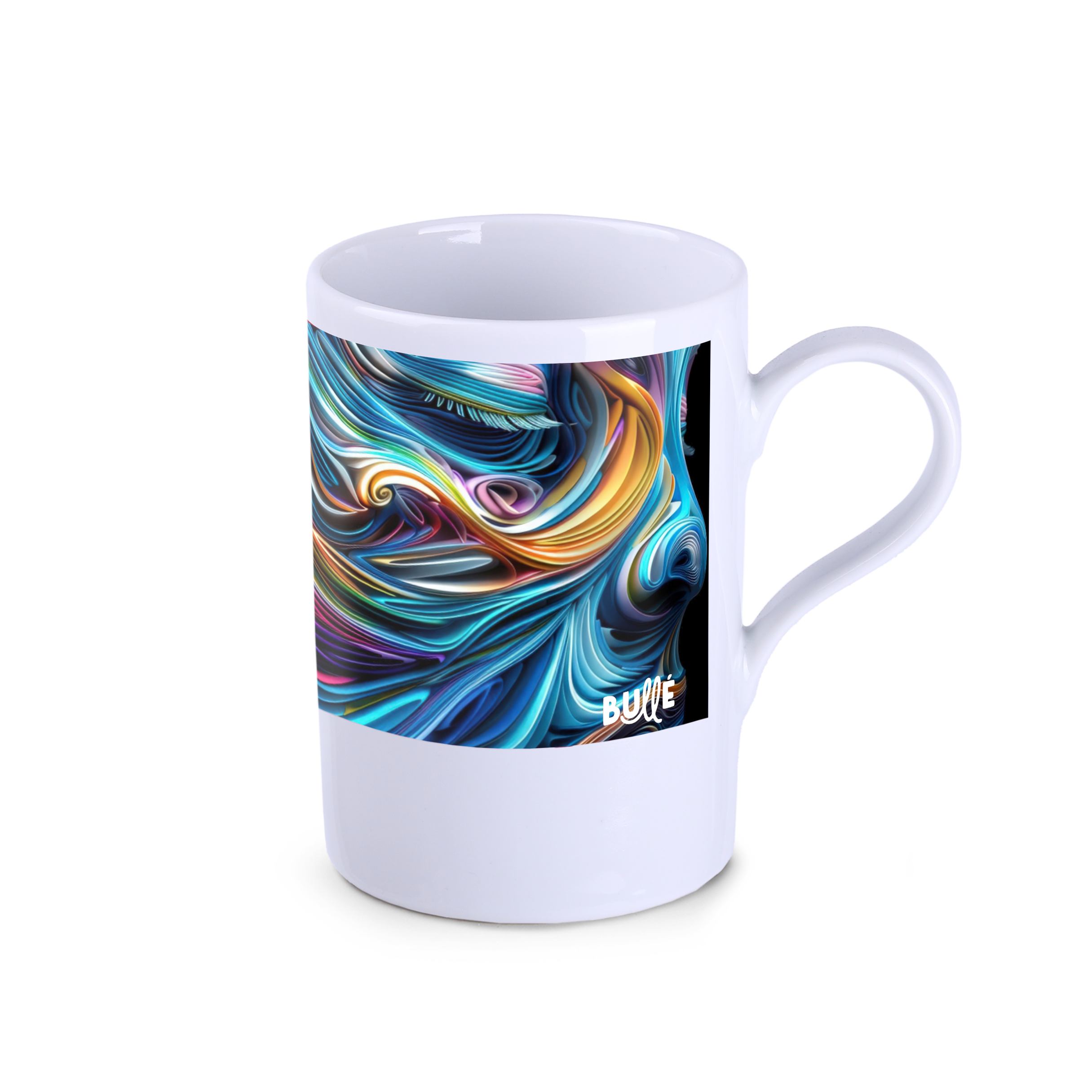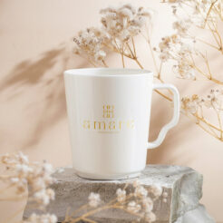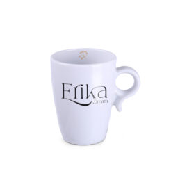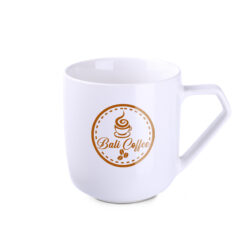 An interesting porcelain mug with a simple cylindrical shape. It has a fashionable, ergonomic handle. Produced in Europe.