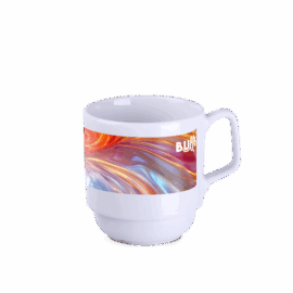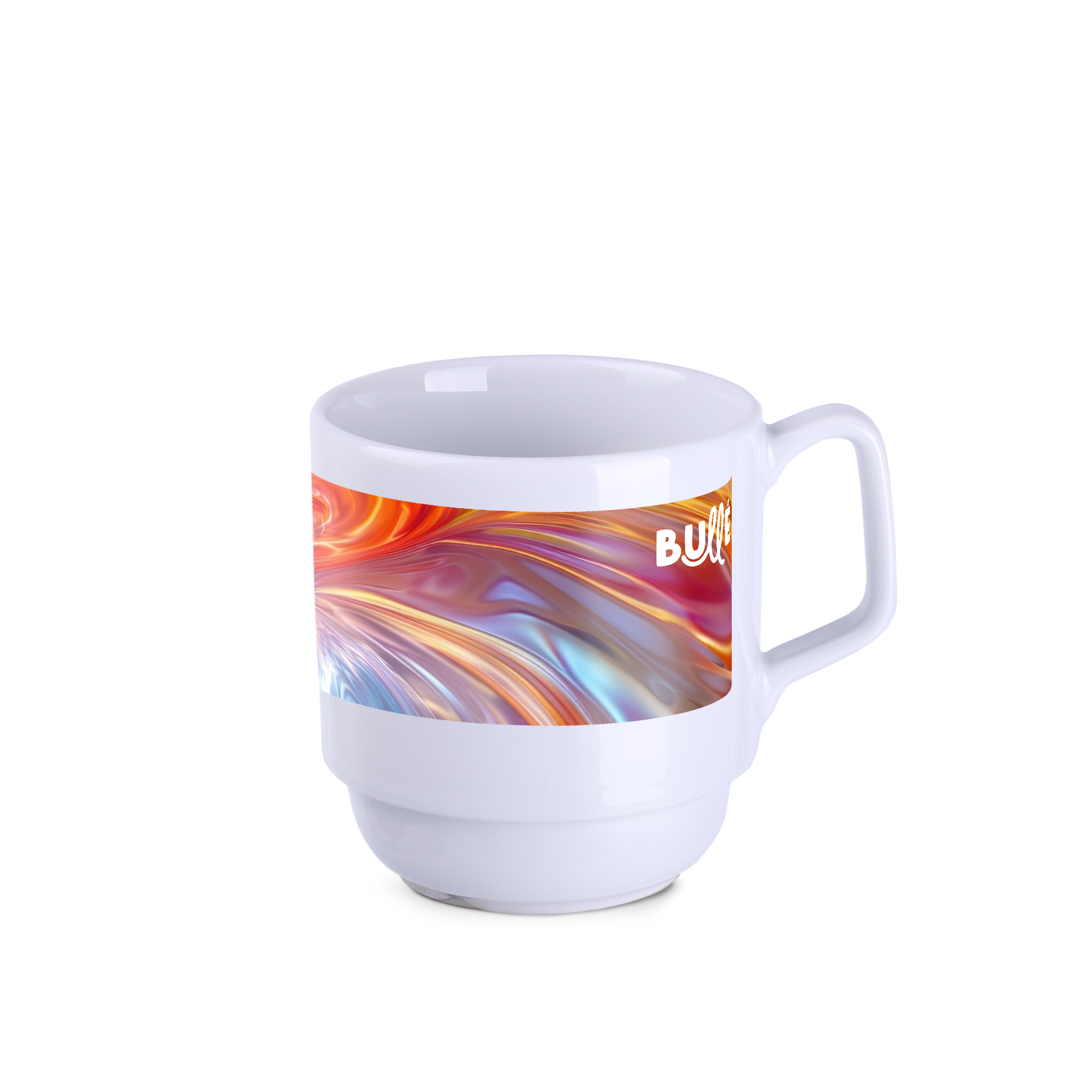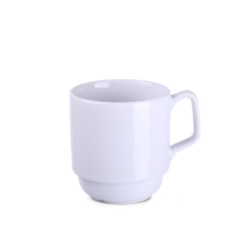 Porcelain mug with an original design. Its shape allows for stacking. It has special channels on the bottom that allow water remaining after washing in the dishwasher to be drained away. Produced in Europe.