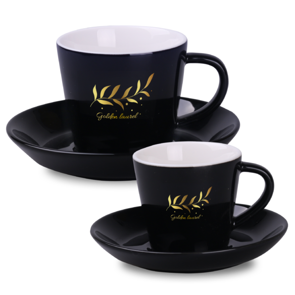A black cup with a simple, classic shape. Made of porcelain. It features an ergonomic handle and a large area for decorations. Available in two capacities