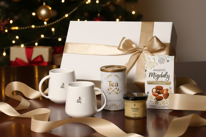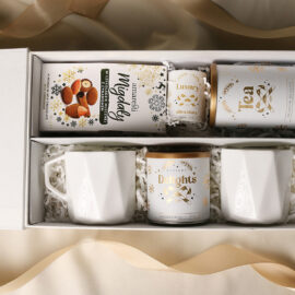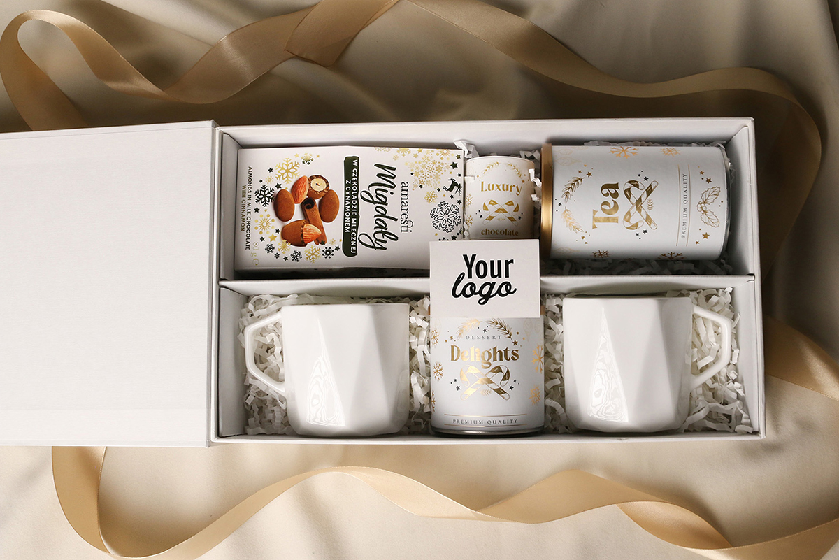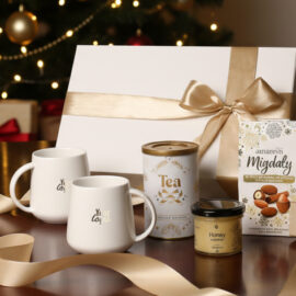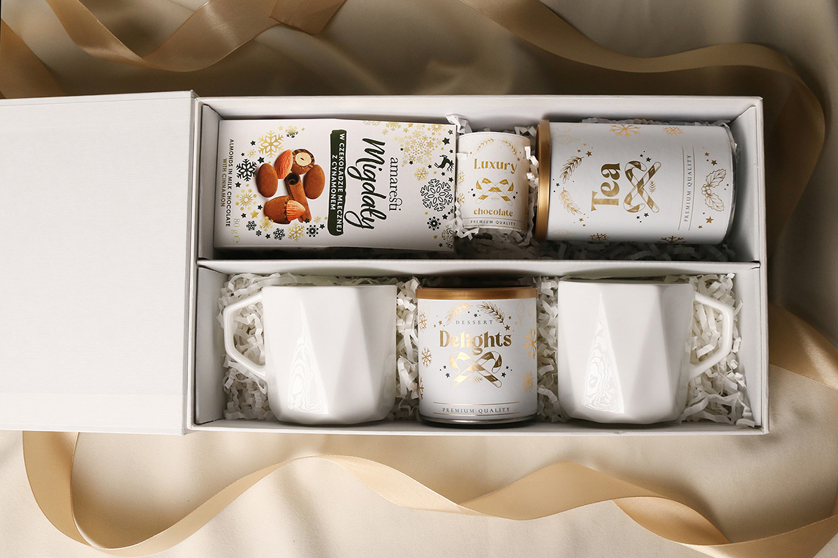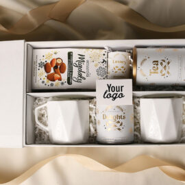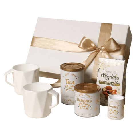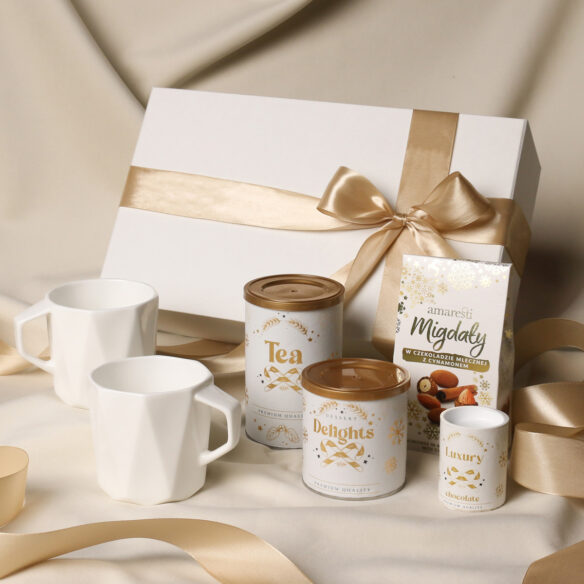 The set includes:Crown white mug (2 pcs) with optional decoration,Sencha green tea with cherries and rose petals, packaged in a tube with a winter motif,Amaresti Pralines – almonds in chocolate with cinnamon,Dessert Delights – blackcurrant in white chocolate,Luxury Chocolate – Belgian drinking chocolate in a tube with a winter motif,All in a stylish, snow-white package with a magnet.